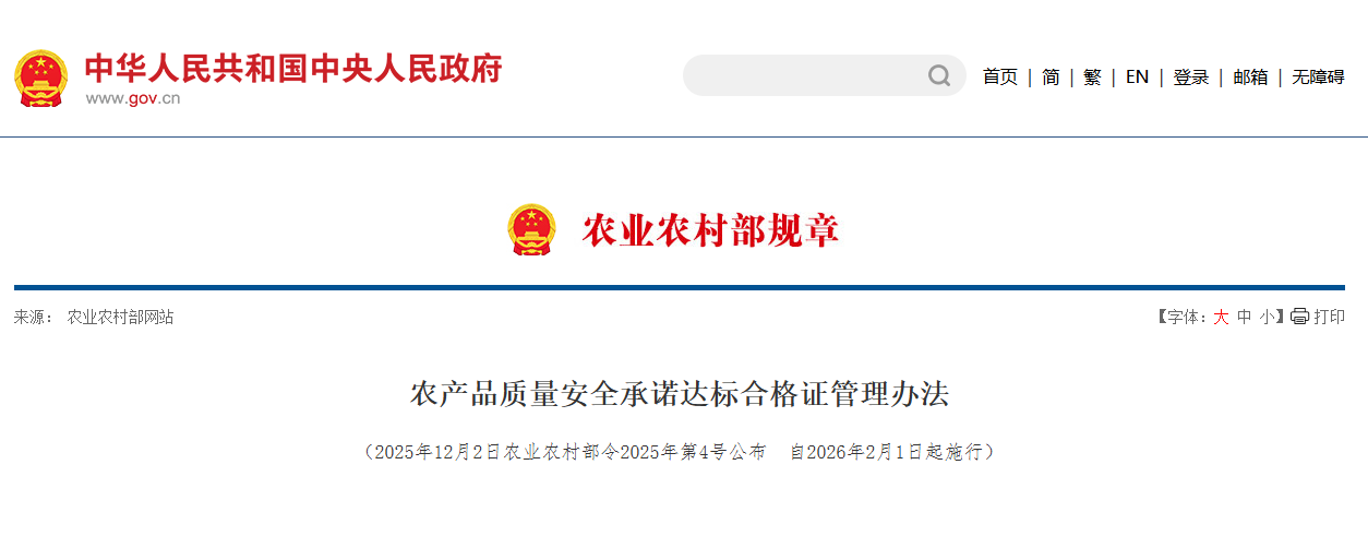 2026年2月1日起,《农产品质量安全承诺达标合格证管理办法》将施行,作为农产品质量安全法配套制度,明确合格证定义、适用范围及开具、收取、保存要求,旨在夯实主体责任、推进产地准出与市场准入衔接、提升质量安全管控水平。